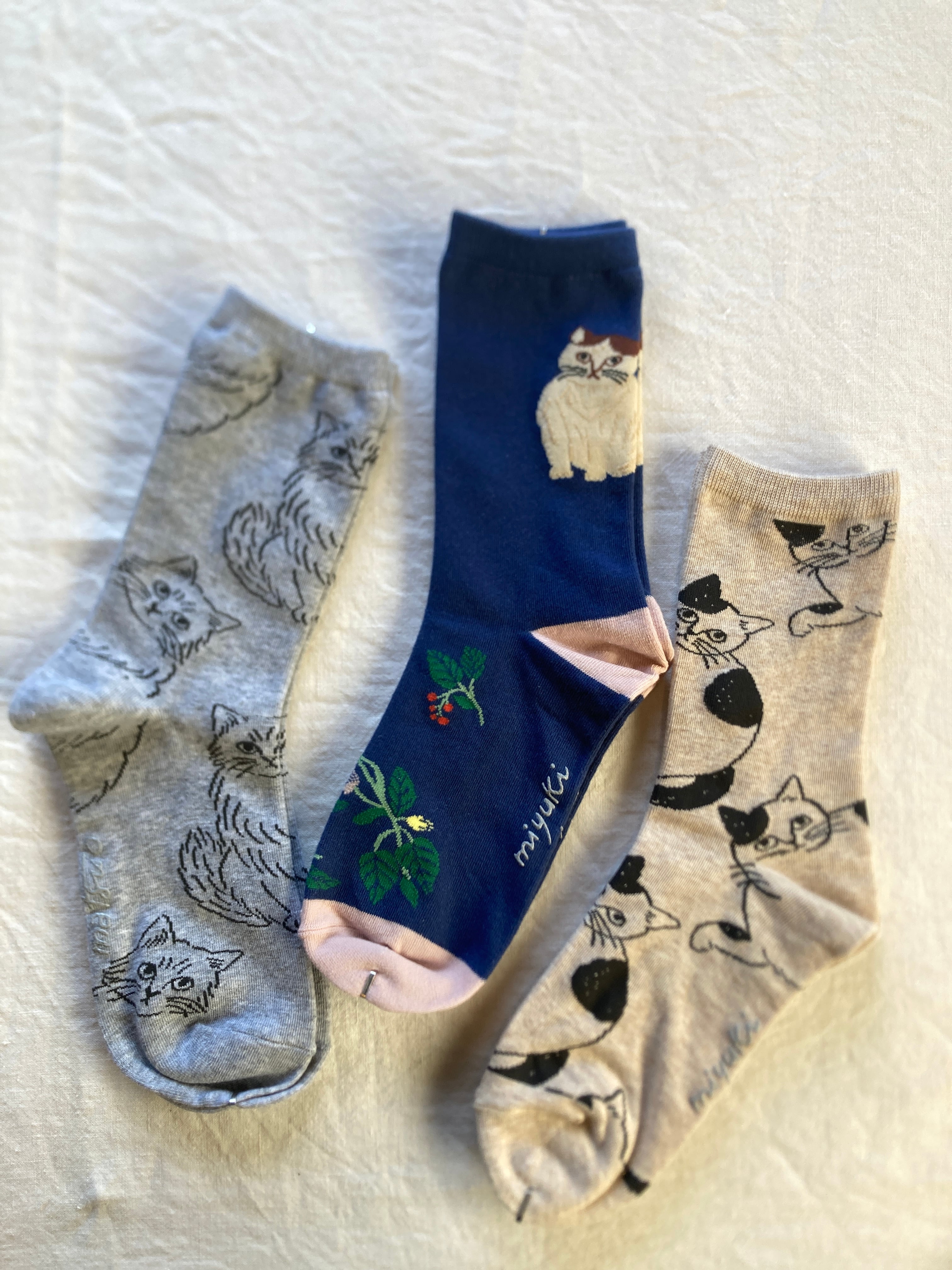 松尾ミユキさんの線画のネコが織られたソックスに、新しいネコたちが登場です。